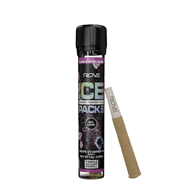Rove 1G Ice Pack Preroll, the world’s first triple-infused preroll. Made with premium-grade flower fully-infused with THCA diamonds and solventless ice hash rosin then they're expertly rolled. Super smooth and ultra potent, Rove Ice Packs test up to 40% THC. Welcome to the next evolution of prerolls. Premium Organic Flower.