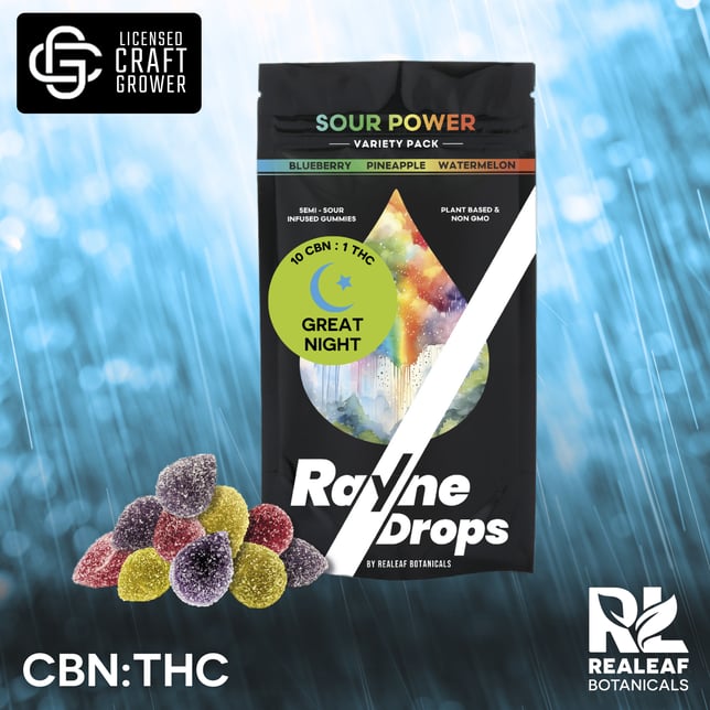 Unwind and drift into deep relaxation with Great Night Rayne Drop Gummies, a carefully crafted blend of CBD, CBN, and THC designed to support restful sleep and relief from discomfort. Perfect for nighttime use, these gummies help you settle in, soothe the body, and quiet the mind.