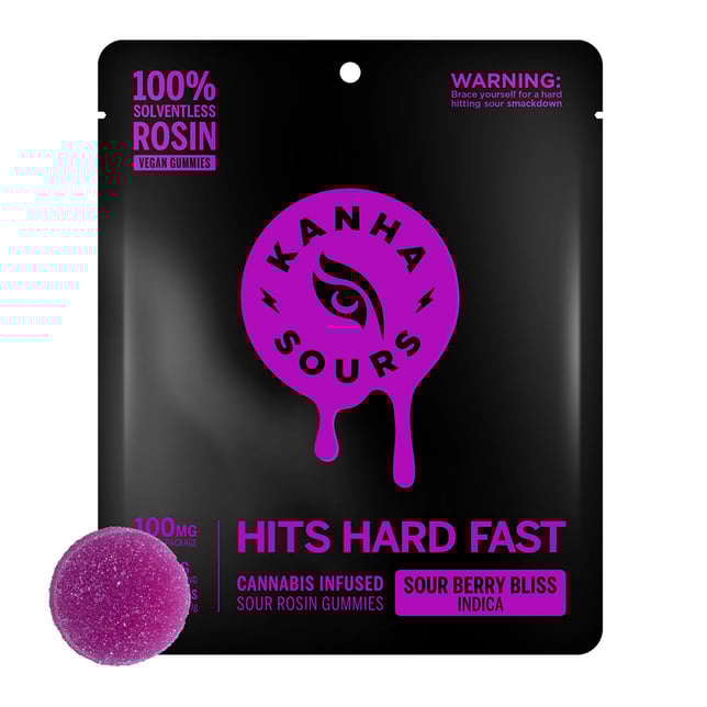 Berry sourness that chills you out. Sour Berry Bliss vegan gummies contain 10mg of fast-acting THC per piece, featuring solventless rosin from an indica strain. With 100mg of THC per pack, these gummies will smack you into chill mode.