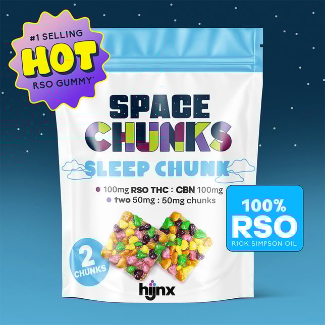 Our RSO:CBN Space Chunks give you a full spectrum, full body effect and will blast you right off to sleep one high-dose gummy at a time!