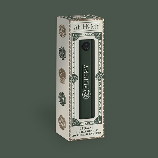 Where science meets magic! Alchemy 510 thread Vape Battery. Works with all standard 0.5g and 1g vape carts. Features: Digital Display, USB-C Rapid Charging, Precise Variable Voltage (2v-4v). Variable Voltage Settings: With Battery On, press button 3 times rapidly. Voltage number will start flashing. Click button to increase voltage per 0.1V until the desired voltage is reached. To turn On/Off or Lock/Unlock click button 5x rapidly